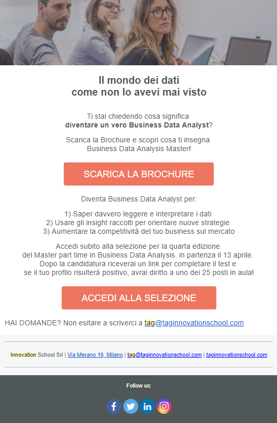 - L’invito, tramite call-to-action, a scaricare la brochure del corso, per rendere possibile il download ripetuto e posticipato