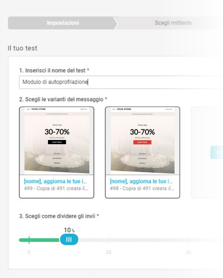 Vai su Nuovo A/B test e seleziona i messaggi da utilizzare come varianti. Importante: seleziona come metrica per il test Miglior tasso di clic. Scegli poi i destinatari e il numero di ore al termine del quale l’email con le migliori performance sarà inviata ai contatti rimanenti.