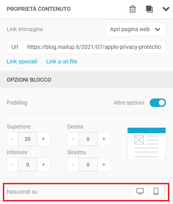 Per evitare pericolosi errori di visualizzazione non serve conoscere il codice HTML: basta affidarsi a un editor che consente di creare email dal design modulare, automaticamente ottimizzato per mobile, come l’editor drag & drop BEE integrato alla piattaforma MailUp. Per essere ulteriormente coperto da eventuali errori, il nostro consiglio è quello di controllare per la resa delle tue email prima di inviarle ai tuoi contatti e verificare che non vi siano problemi nella visualizzazione di alcuni contenuti sul device mobile. Nel caso in cui riscontrassi questo tipo di problematica, con l’editor BEE puoi scegliere di nascondere alcuni contenuti da mobile e renderli visibili solo da deskto con l’opzione Nascondi su mobile del blocco Proprietà contenuto.