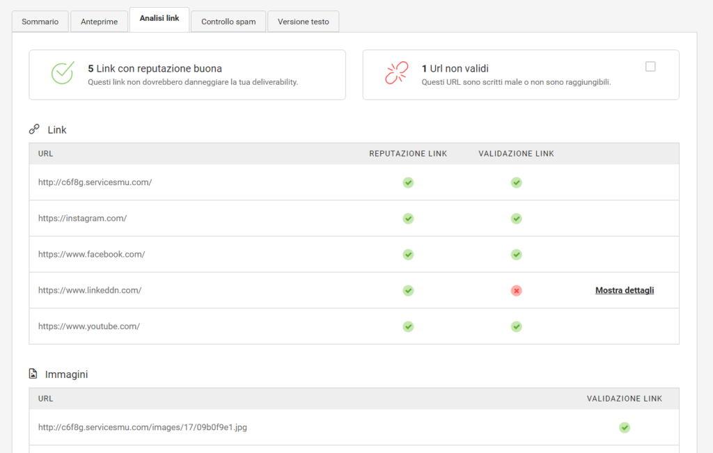 I link sono il ponte di collegamento tra l’email e la pagina di atterraggio in cui l’utente può completare l’azione e concretizzare la conversione. Inserire link scorretti, presenti in qualche blacklist o che rimandano a pagine inesistenti è sicuramente l’ultimo degli errori fondamentali che possono ostacolare le performance della tua campagna e impedire anche all’utente più interessato e predisposto di finalizzare una conversione nelle tue pagine di atterraggio. Evitare che questo accada non è impossibile: grazie a strumenti come l’Analisi link messo a disposizione da MailUp, puoi far lavorare la piattaforma di invio al posto tuo, controllando semplicemente la reputazione e validità dei link direttamente dalla sezione Controlla: