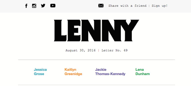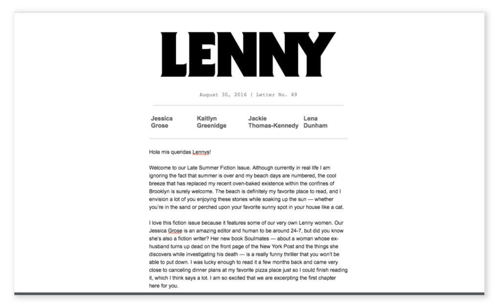Troviamo spesso link di ancoraggio molto efficaci in Lenny Letter, una newsletter ideata dall’attrice e regista Lena Dunham e dalla sua miglior amica e regista Jenni Konner. Lenny contiene principalmente testi lunghi, saggi e storie che invitano alla riflessione stimolando l’interesse dei lettori.
