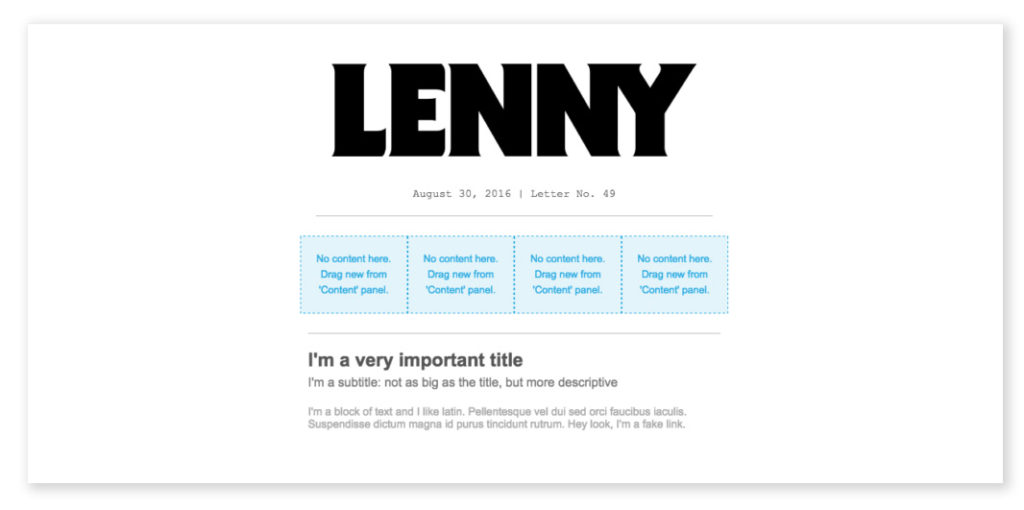 Per iniziare, ricreeremo l’email di Lenny Letter nell’editor BEE. L’intestazione è semplice: usando un layout di base a una colonna, trascina l’immagine di Lenny e aggiungi il testo (in Courier) sotto di essa. Quindi, trascina una struttura a quattro colonne per organizzare gli anchor link in alto.