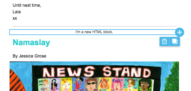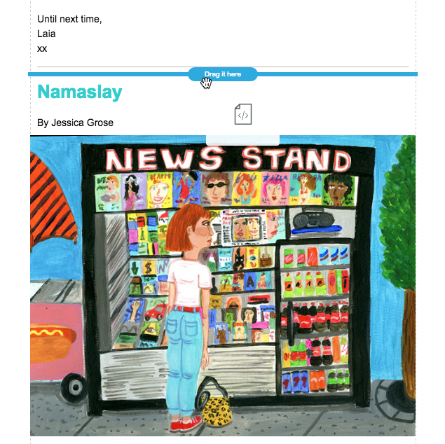 Trascina e rilascia il blocco HTML nel punto a cui desideri che il link “salti”; nel nostro caso, proprio sopra la storia di Jessica Grose intitolata “Namaslay”.