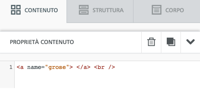 Per creare l’ancoraggio, incolla quanto segue in una riga di codice HTML nel campo Proprietà Contenuto del blocco HTML personalizzato sulla destra: <a name=”grose”> </a> <br />