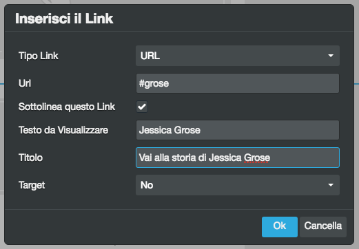 Nel menu, collega l’ancoraggio inserendo #grose nel campo URL.