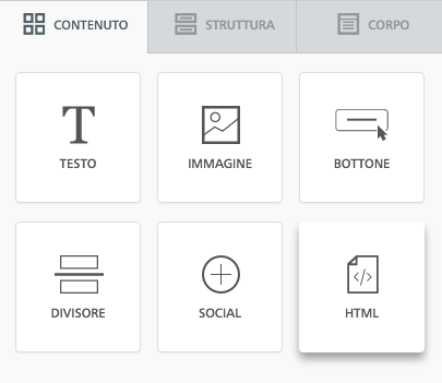 Adesso è il momento di rinominare e posizionare il primo ancoraggio nella sezione corretta dell’email. Per questo passaggio useremo il blocco di contenuto HTML personalizzato presente nel menu Contenuto per aggiungere l’ancoraggio (devi pensare a questo elemento come a un segnalibro).