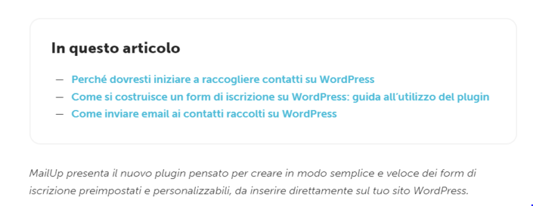 Ecco un rapido esempio preso dal nostro blog, in cui i link di ancoraggio sono utilizzati nella parte superiore della pagina in modo che i lettori possano comprendere i temi trattati nell’articolo e andare direttamente al paragrafo di interesse.