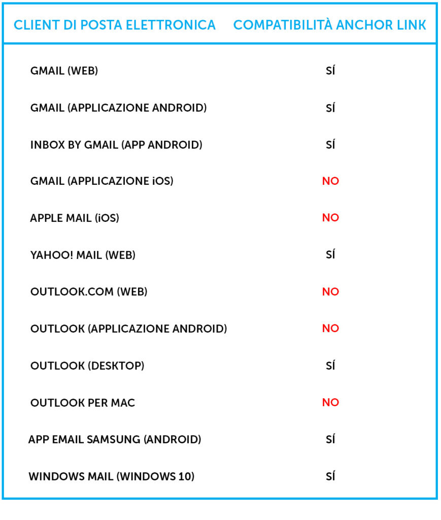 Compatibilità degli anchor link con i client di posta elettronica