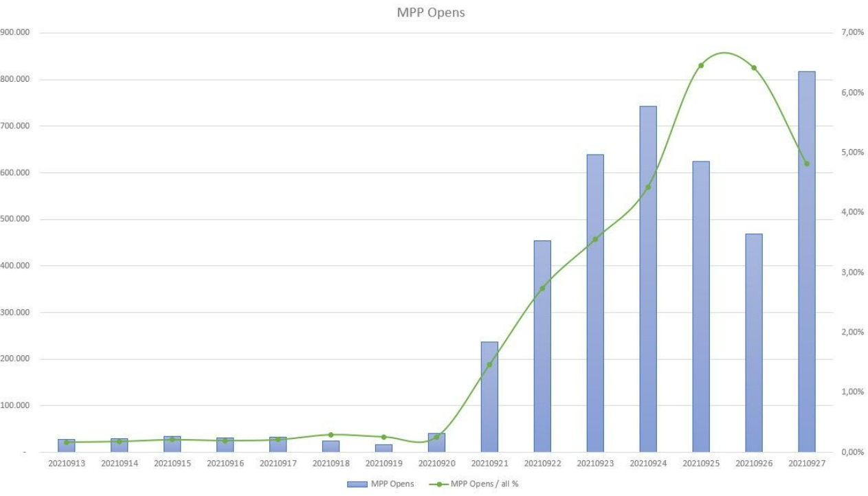 Nel complesso, però, occorre sottolineare che tra tutti i clienti MailUp il numero di quelli che stanno risentendo concretamente degli impatti della MPP è comunque molto ridotto ed esiguo: possiamo contare circa 30 clienti in totale che nell’ultimo mese ha registrato un tasso di aperture “non reali” superiore al 20% e, di questi 30, solo pochi stanno mostrando dalle loro statistiche impatti significativi.