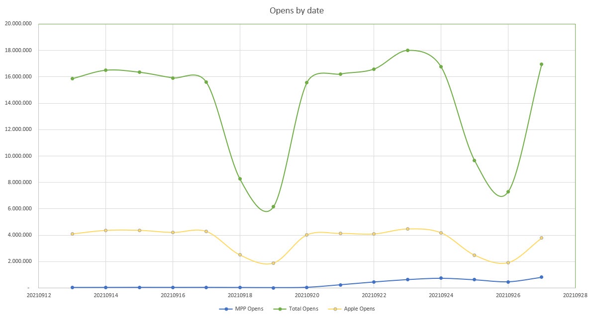 La Mail Privacy Protection di Apple rende impossibile determinare il comportamento dell’utente, introducendo un rumore di fondo, ovvero una serie di aperture “non reali”, non generate dall’utente ma dai sistemi di Apple e impossibili da ricondurre a un’azione reale da parte del destinatario.