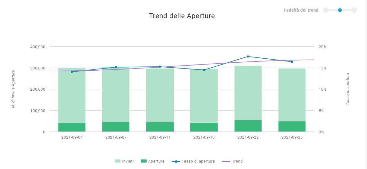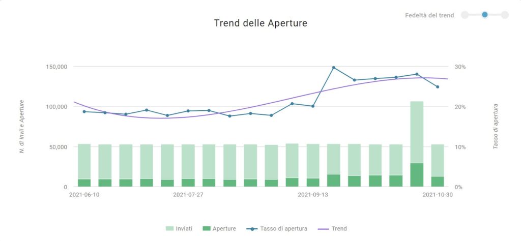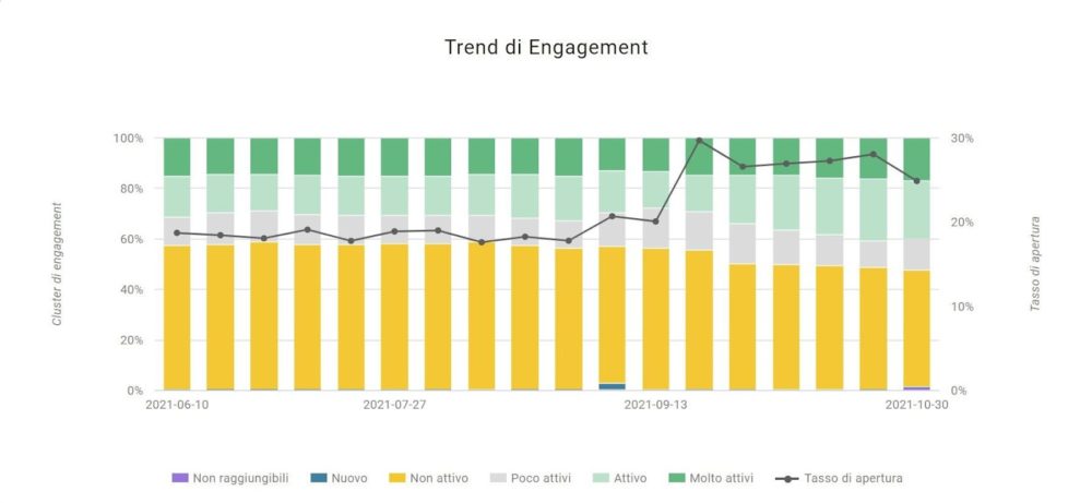 Anche nei Trend di engagement (grafico 3), si assiste a un lieve aumento dei cluster di utenti attivi e molto attivi rispetto agli inattivi, senza che il cliente in questione abbia fatto variazioni di rilievo nel target di destinatari.