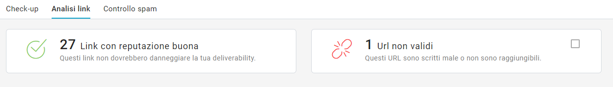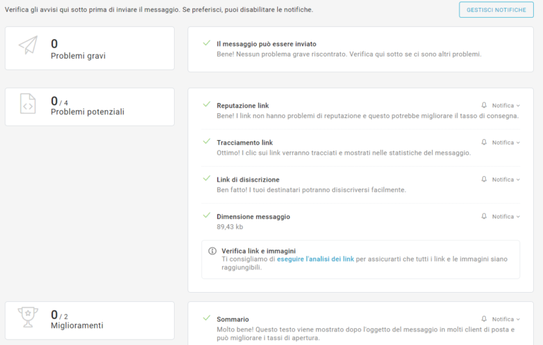 – Check-up del messaggio, che identifica i problemi gravi, le problematiche potenziali (reputazione, tracciamento dei link, dimensione del messaggio e presenza del link di disiscrizione) e le opportunità di miglioramento