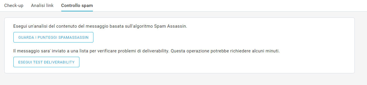 – Controllo spam, che permette di effettuare un’analisi del contenuto del messaggio controllando il punteggio SpamAssassin e di eseguire un test di deliverability.