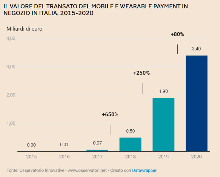 I dati dell’Osservatorio fanno emergere anche una crescita dei pagamenti tramite smartphone o wearable in negozio, che hanno superato i 3,4 miliardi con un incremento dell’80% rispetto al 2019.