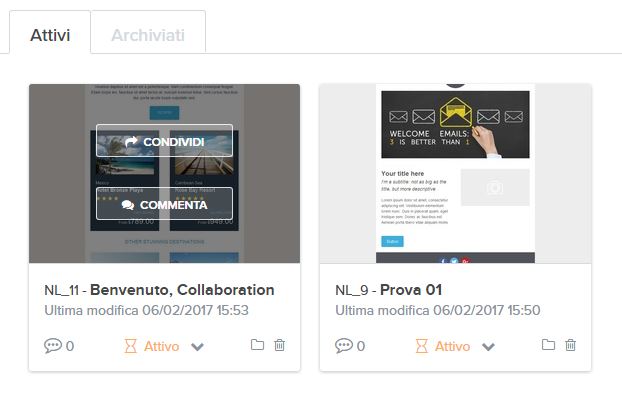 Una volta aperto il processo di collaborazione su uno specifico messaggio, ne viene visualizzato lo status in diversi punti della piattaforma MailUp. Ad esempio, nella sezione Elenco apparirà un fumetto accompagnato dal numero di commenti già inseriti.