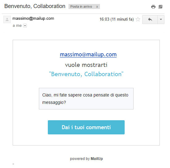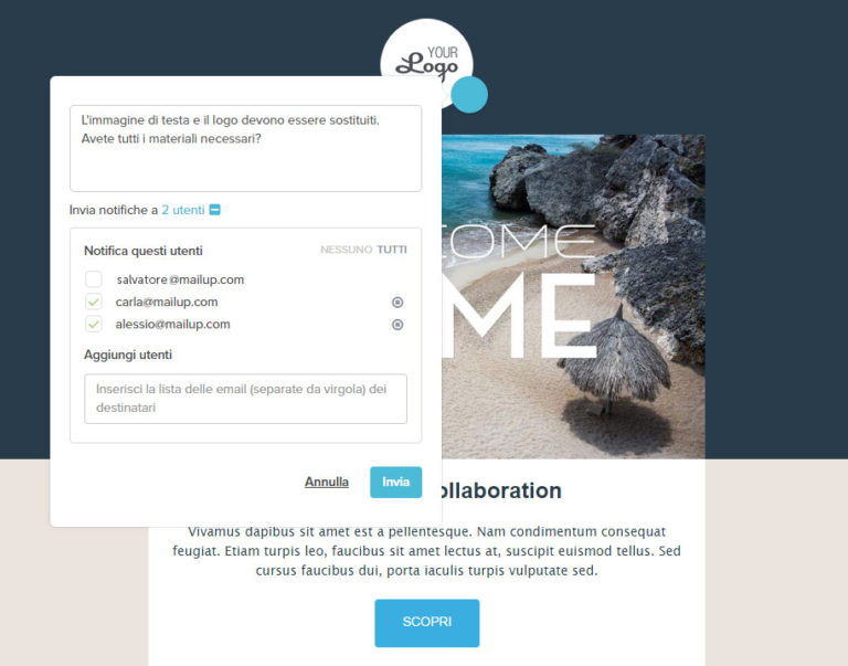 Grazie a Collaboration hai a disposizione uno strumento efficiente e semplice da usare per chiedere e dare feedback sulle email, collaborare attivamente alla creazione del messaggio e assicurarsi che tutte le parti coinvolte siano d’accordo sull’approvazione delle comunicazioni.