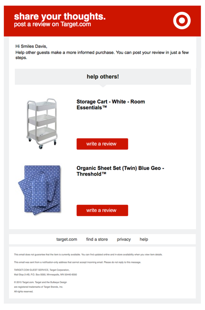 Per coltivare il rapporto con l’utente è importante accompagnarlo fino alla fine del suo percorso, facendogli capire quanto la sua opinione conti. Non esitare quindi a chiedere ai tuoi clienti il loro grado di soddisfazione o se raccomandano il tuo prodotto o servizio. Crea delle comunicazioni automatizzate con cui richiedere una valutazione o una recensione dell’acquisto e programma delle email di sondaggio: ricevere un feedback è il modo migliore per capire dove migliorare, cosa cambiare e quali sono le aspettative da soddisfare.