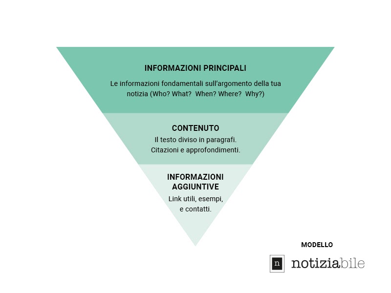 - quante e quali informazioni inserire nel tuo contenuto, per evitare di bombardare l’utente di dettagli che distolgono l’attenzione dalle informazioni principali. Per svolgere questo lavoro di selezione segui la tecnica della piramide rovesciata: