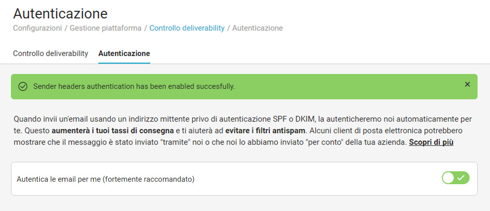Agli utenti viene inoltre spiegata la differenza tra utilizzare e non utilizzare l’autenticazione fornita di default da MailUp. Anche in questo caso, vengono informati in modo semplice di ciò che significa creare una relazione tra il loro indirizzo email visualizzato nel campo mittente e l’infrastruttura di invio MailUp. Viene chiarificato, inoltre, in che modo tale relazione venga instaurata a seconda che la funzione di controllo sia attiva o meno.