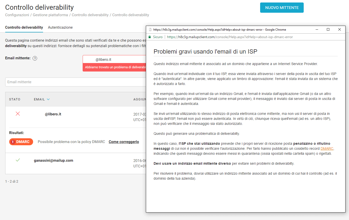 Se il problema è critico, l’avviso è di colore rosso, e le istruzioni fornite danno indicazioni su cosa fare e come. Ad esempio, nello screenshot in basso, gli utenti vengono avvisati del fatto che utilizzare un’email @libero.it come mittente non è una buona idea.