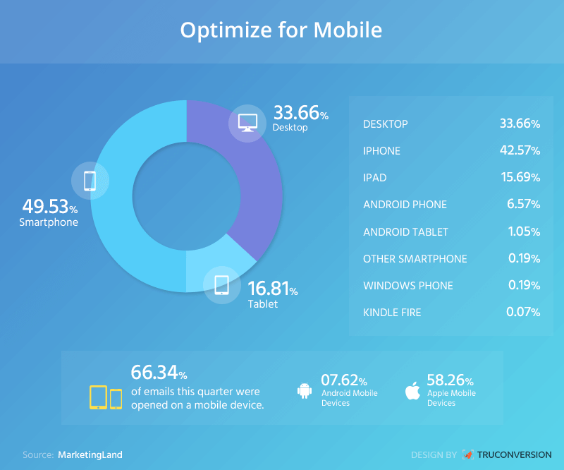 Uno studio di Return Path ha analizzato più di 27 miliardi di email aperte tra maggio 2016 e aprile 2017, rivelando che oltre il 55% è stato aperto su un dispositivo mobile. Nei fine settimana il tasso saliva fino al 60%. Per ribadire il concetto, ecco un altro studio, questa volta di MarketingLand.