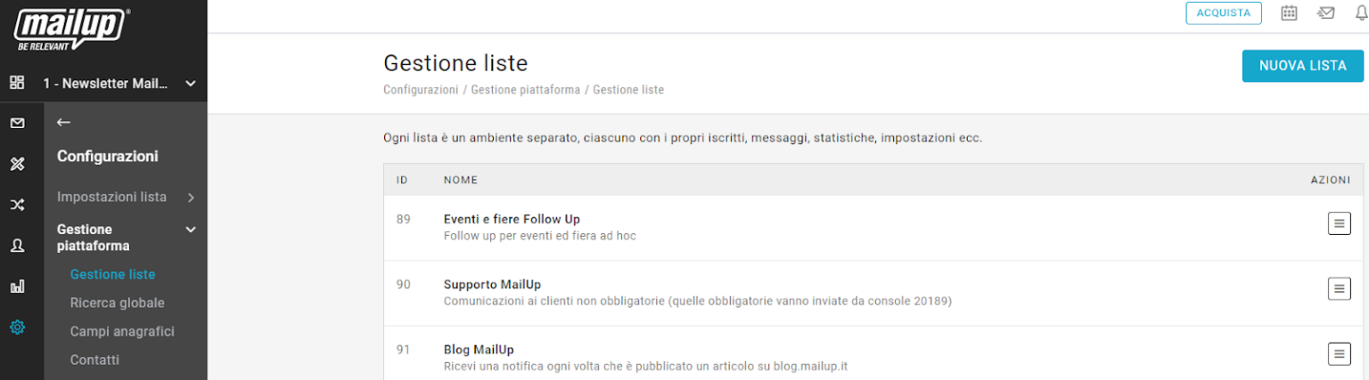 Un esempio di ambiente multi-lista, direttamente dalla nostra piattaforma MailUp usata per le nostre newsletter