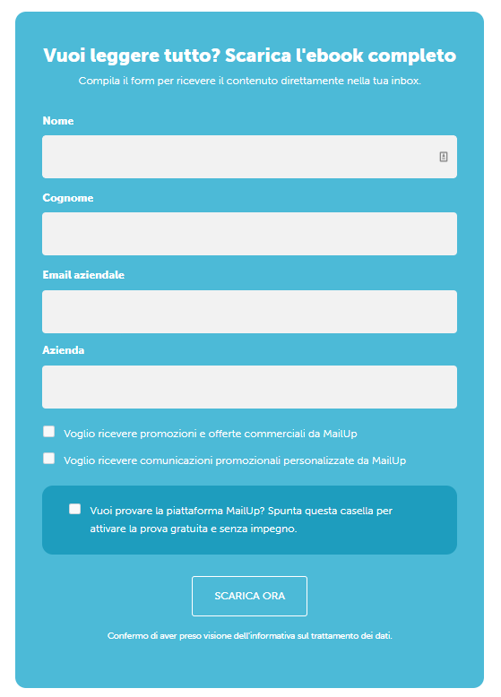 - tramite download di contenuti rilevanti. Guide, ebook, webinar, white paper: tutte le risorse che crei possono rappresentare opportunità per ottenere dati importanti e raccogliere nuovi indirizzi, semplicemente inserendo un form di download per scaricare la risorsa con all’interno un campo email e altre informazioni rilevanti.