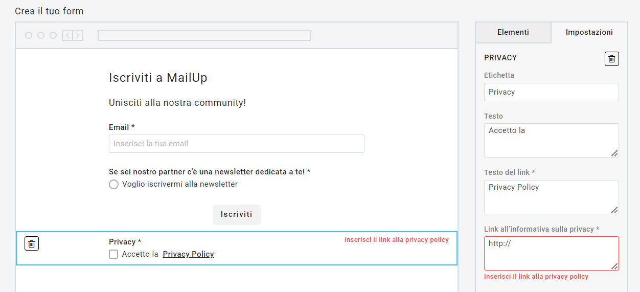 Per aiutarti a non dimenticare questo passaggio fondamentale, la piattaforma MailUp inserisce già tra i contenuti da trascinare nel form di iscrizione drag & drop un campo editabile che può essere utilizzato per la raccolta di tutti i consensi privacy e con un reminder che ti ricorda di inserire il link all’informativa sulla privacy.