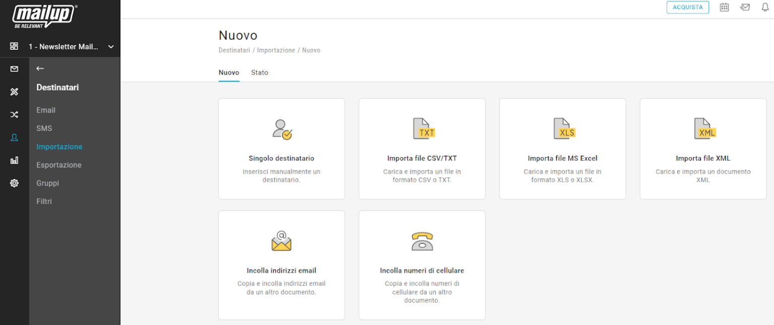 Importare un elenco di contatti email o un singolo indirizzo è semplicissimo. Con MailUp ti basta andare su Destinatari > Importazione e selezionare tra i tanti metodi a disposizione quello che fa al caso tuo: