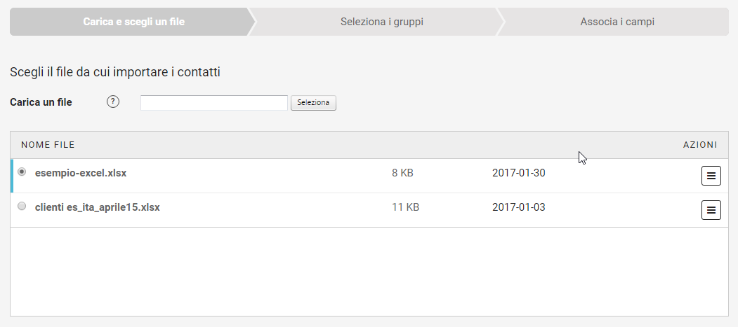 Per l’importazione massiva di contatti ti consigliamo di selezionare Importa file CSV oppure Importa file MS Excel.