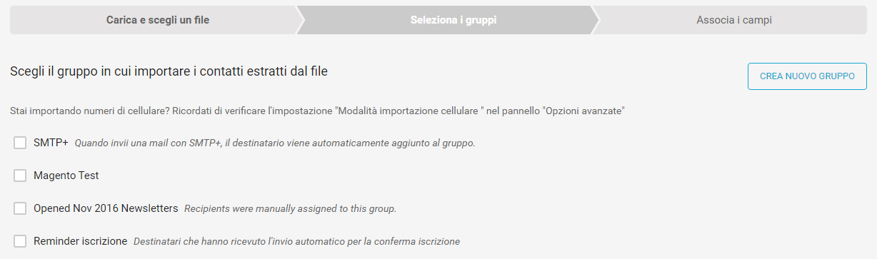 - Vai avanti e seleziona il gruppo della tua lista in cui vuoi importare i contatti oppure clicca su Crea nuovo gruppo