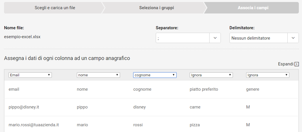 - Ora procedi e associa le colonne del tuo file ai campi anagrafici di MailUp. Cosa significa? Semplicemente che se la colonna A del tuo file è quella con l’indirizzo email e le colonne B e C contengono il nome e il cognome dei tuoi contatti dovrai associare a ognuna di queste tre colonne i rispettivi campi anagrafici Indirizzo email, Nome e Cognome di MailUp. Se la prima riga del tuo file è quella che contiene i nomi dei campi, devi solo spuntare la casella “Ignora la prima riga”.