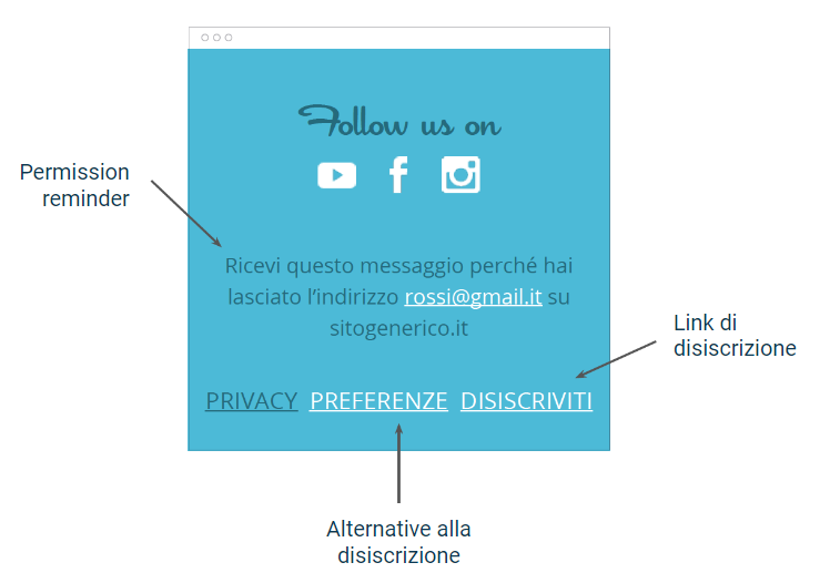 Oltre a link di disiscrizione e centro preferenze è sempre utile includere nel footer anche il Permission reminder, ovvero una frase che ricorda all’utente come e perché sta ricevendo quel tipo di comunicazione.