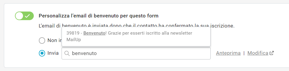 Se vuoi quindi associare a un form una specifica email di benvenuto, dovrai prima creare l’email usando l’editor drag & drop e poi selezionarla nell’elenco di email tra cui scegliere come mostrato nell’immagine.