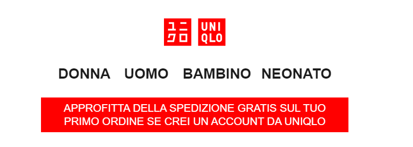 Se includi un menu di navigazione nell’header – molto importante soprattutto per le realtà e-commerce – riduci l’ingombro e ottimizza l’header utilizzando il nome del marchio o il logo in alto. Ecco come fa, in modo molto efficace, Uniqlo: