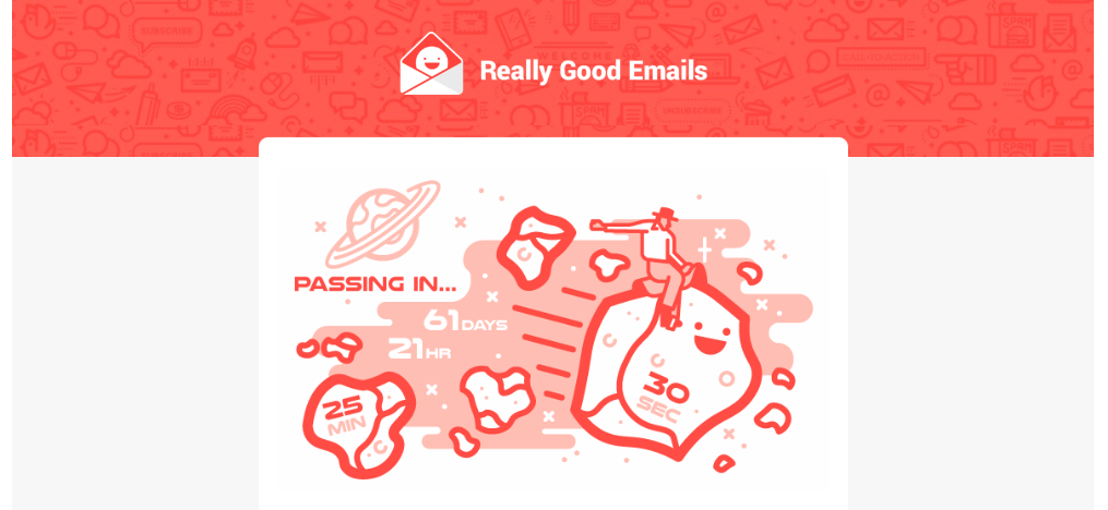 Un altro modo semplice e versatile per creare un header è utilizzare il colore. Niente di complesso o artistico o sperimentale. Usa semplicemente il colore del tuo brand. Ecco un esempio molto basic da Really Good Emails, che opta per il colore corallo della propria identità visiva; semplice ma molto efficace.