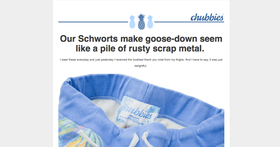 Questo permette di rendere le tue email dinamiche e interessanti. E Chubbies lo fa senza mai allontanarsi dal coerente utilizzo di logo e colore, rendendo sempre chiara e consistente la propria brand identity.