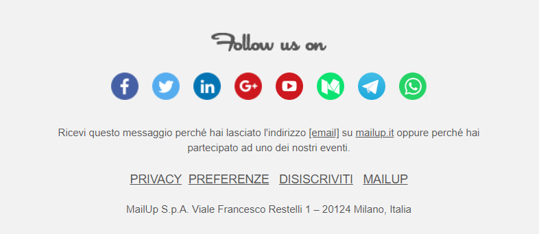Le leggi anti-spam della maggior parte dei paesi richiedono che alcune informazioni siano necessariamente incluse nell’email, e il footer è il luogo deputato a ospitarle.