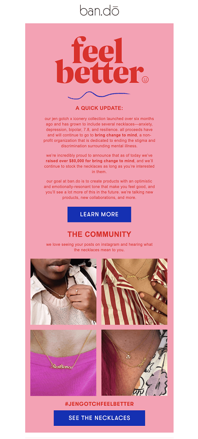 Non solo immagini e colori: per avere un forte impatto grafico, un’email può ricercare il suo appeal anche tra i font, nel versante tipografico. Un recente trend fa uso di caratteri serif di grandi dimensioni e dal look un po’ retró, elegante e fresco.