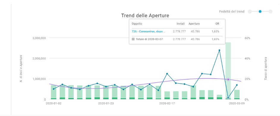 Qualche grafico può rendere meglio l’idea di cosa sta accadendo in questi giorni. Ecco un cliente che si è trovato costretto a quintuplicare il numero di email inviate in un giorno, portandolo a quasi 3 milioni. All’interno sono stati inclusi anche tutti i contatti inattivi della sua lista.