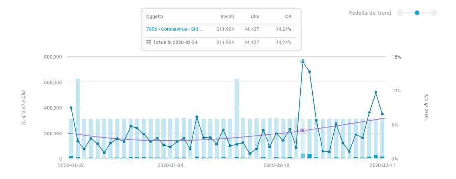 Sappiamo come le attività dei destinatari sull’email siano proporzionali alla rilevanza del contenuto veicolato. Il grafico che segue mostra il tasso di OR e CR di un cliente. Quando in media si registra un 20% di OR e un 4% di CR, un messaggio importante legato all’emergenza coronavirus ha sospinto il tasso di apertura a quasi 40% (il doppio) e il tasso di clic al 15% (+73%).