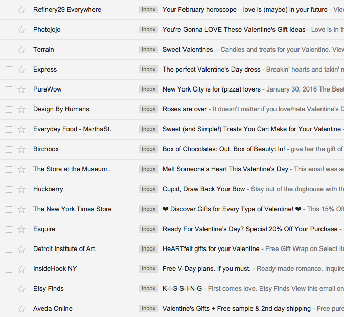 Secondo Email on Acid, il volume di posta elettronica in occasione della festa degli innamorati è secondo solamente al periodo natalizio. Ciò significa che è arrivato il momento di aggiungere un tocco di dolcezza all’oggetto dell’email.