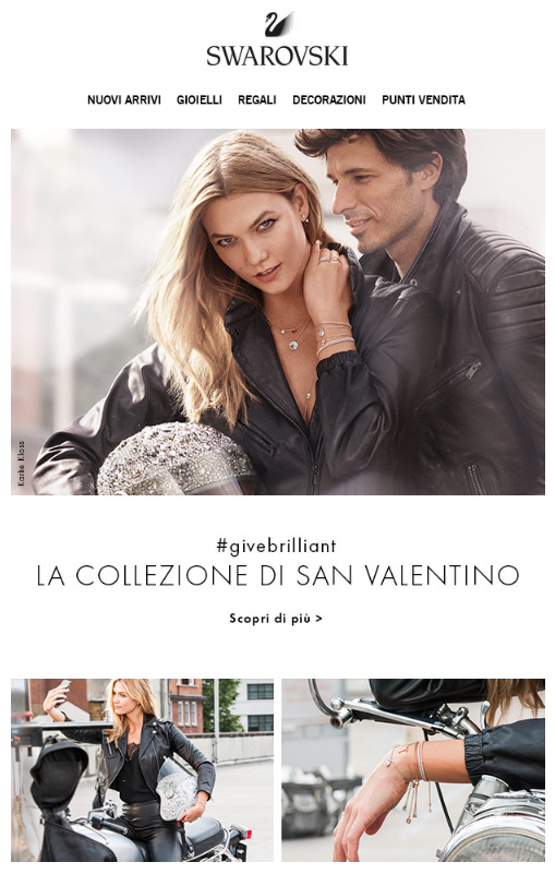 La casella di posta dei tuoi clienti è probabilmente già piena di cuoricini, bacetti e altre immagini piene di tenerezza. Rendi originale il tuo messaggio scegliendo un design di impatto che faccia pensare a San Valentino, invece che le solite immagini troppo melense. Questo esempio di Swarovski è perfetto: il romanticismo è richiamato dalla coppia protagonista e dal copy, ma lo stile grafico è rock’n’roll e giocato sui toni del bianco e del nero. Un modo sicuramente anticonvenzionale di interpretare il grande classico del regalo prezioso.