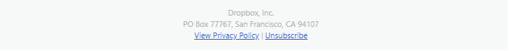È abbastanza pulita e minimal, ma è comunque evidente in fondo al messaggio. Riporta il nome e l’indirizzo dell’azienda, quindi rinfresca nella tua mente il nome “Dropbox”. Ma la firma rimanda anche al sito web.