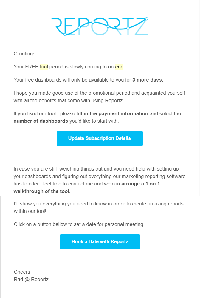 D’altro canto, Reportz invia le sue email transazionali 3 giorni prima della fine del periodo di prova. Chiede agli utenti di compilare i campi relativi al metodo di pagamento o, se questi sono ancora in dubbio in merito all’acquisto del prodotto, di pianificare una dimostrazione individuale con un rappresentante dell’assistenza.