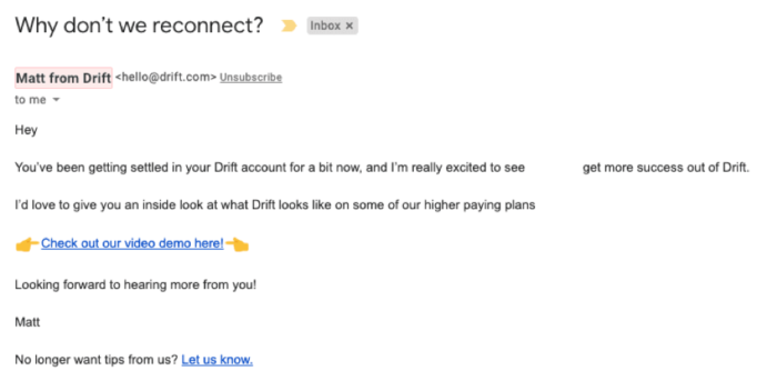 Ecco come Drift utilizza queste email transazionali per ricollegarsi con gli utenti persi: