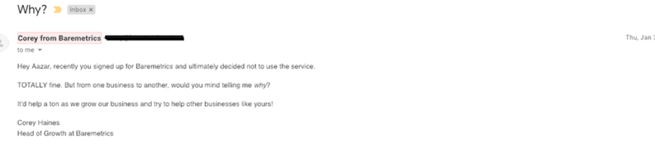 Come si può vedere, Baremetrics utilizza unmessaggio chiaro e diretto verso gli utenti non convertiti.