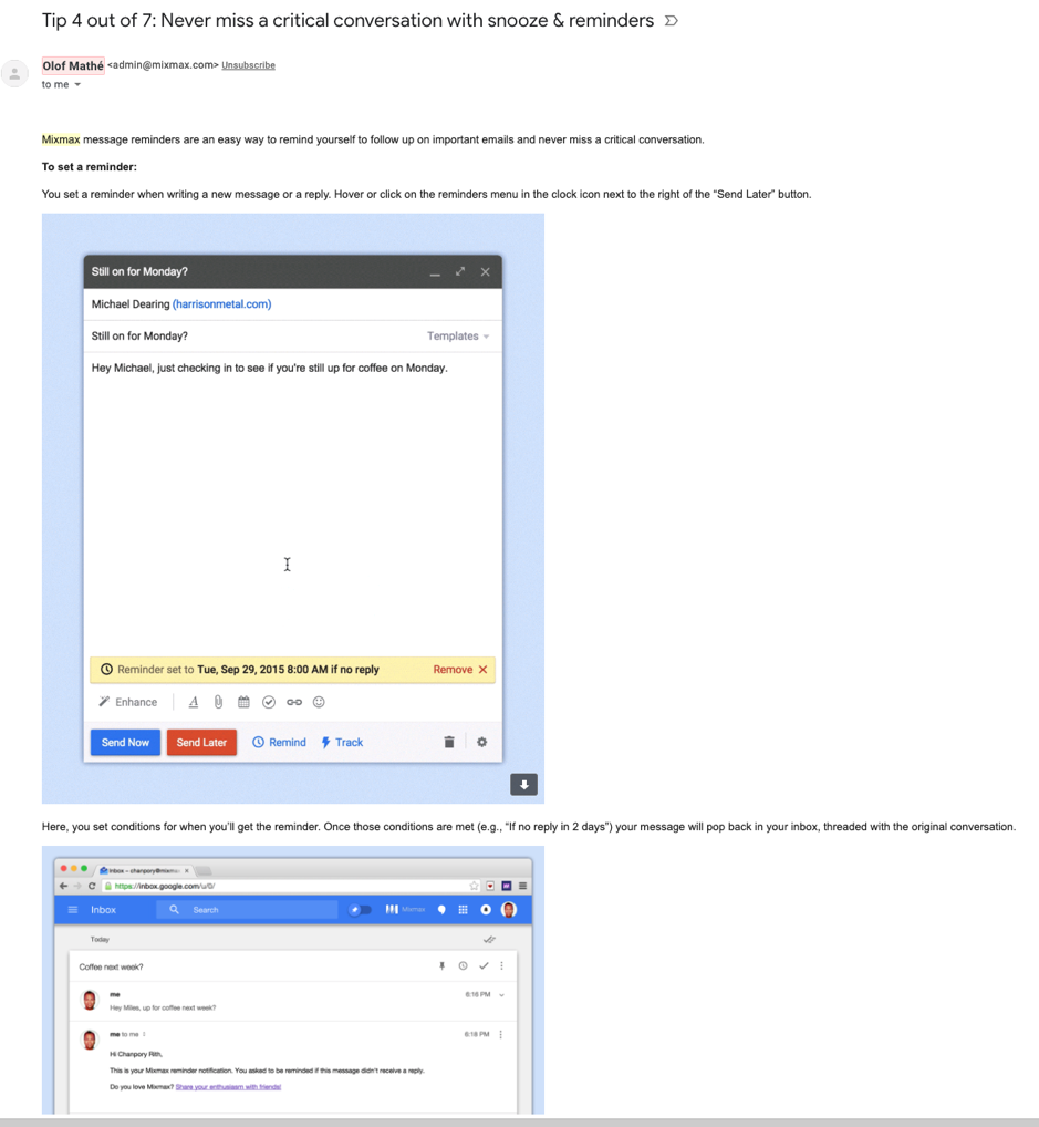 Qui MixMax utilizza le email transazionali per fornire ai propri utenti consigli sull’utilizzo del prodotto. Ognuno di questi suggerimenti fa riferimento a una funzione secondaria che l’utente dovrebbe altrimenti scoprire quasi per caso.