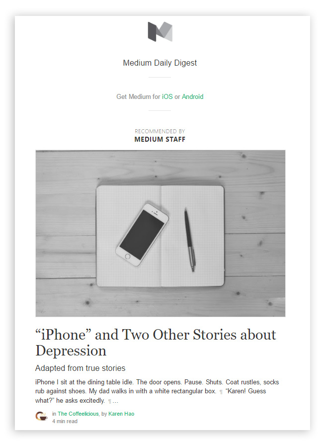 Anche quando i font utilizzati sono diversi, i titoli dovrebbero avere una dimensione almeno doppia rispetto al corpo del testo. Puoi anche giocare con colori e formattazioni per sottolineare il contrasto. Ti portiamo due esempi molto puliti ed efficaci: la newsletter di Medium e una DEM di Kusmi Tea. Entrambi utilizzano un font con grazie per i titoli dei post e un font senza per il corpo del testo, con in più, nel caso di Kusmi Tea, un ulteriore tocco di vivacità dato dai colori.