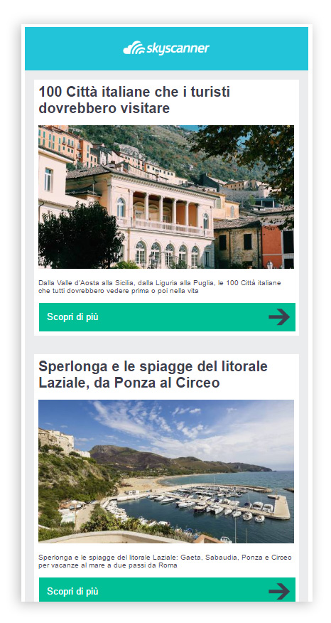 Il consiglio è di (almeno) raddoppiare il corpo carattere dei titoli rispetto al corpo dell’email, spaziandoli bene per migliorare la leggibilità. Ecco l’esempio di Skyscanner, che utilizza l’Arial in tutti i punti della mail: